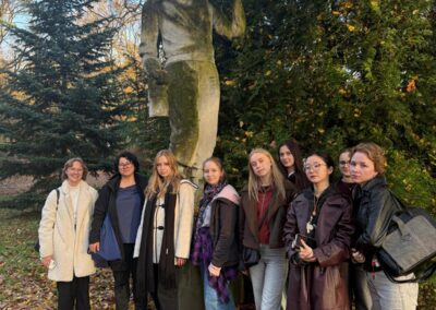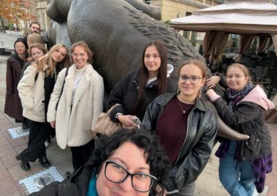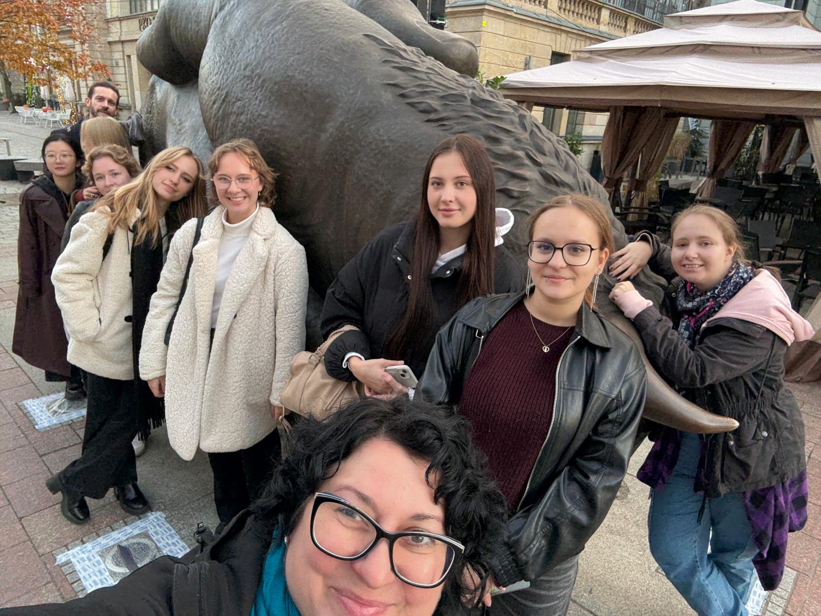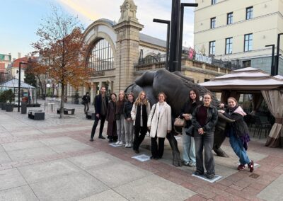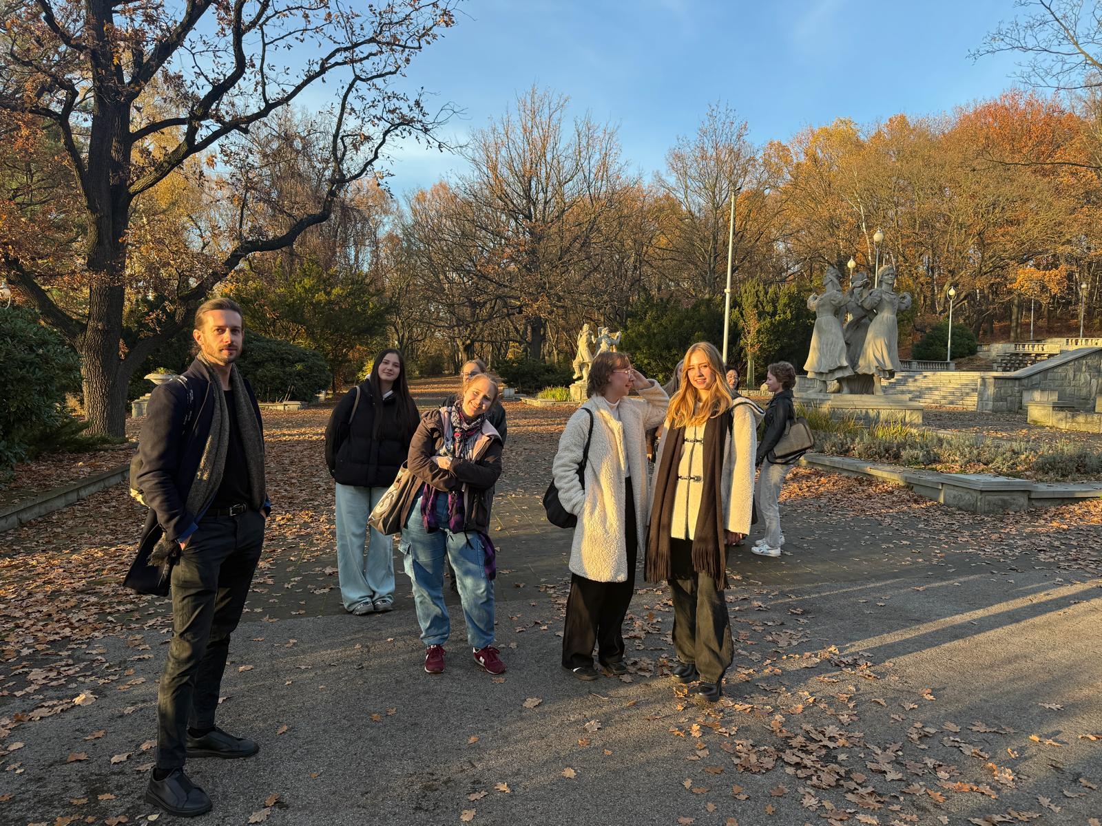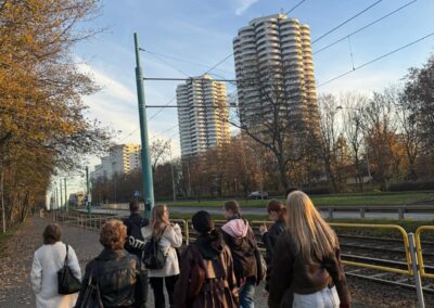 Na zewnątrz piękna polska jesień, czas na zajęcia w terenie! 5 listopada 2025 r. studenci drugiego roku kierunku Design i komunikacja społeczna wybrali się aż do Katowic. Ten intensywnie spędzony dzień rozpoczął się od ciekawej konferencji odbywającej się na Uniwersytecie Ekonomicznym na temat miast – o intrygującej nazwie „IX Colloquium Miejskie. Przyszłość śląskich miast. Procesy Mozaikowej Zmiany Miejskiej – Przez Różnorodność Do Spójności”. Nie pisaliśmy jednak żadnego kolokwium! W otoczeniu ekspertów, naukowców i samorządowców, przysłuchując się poszczególnym debatom, można było sporo dowiedzieć się o zmianach we współczesnych miastach, zjawiskach w nich zachodzących, np. wpływie sztucznej inteligencji, rewitalizacji terenów poprzemysłowych z poszanowaniem dziedzictwa kulturowego i działań samorządów lokalnych na rzecz poprawy jakości życia. Problematyka obrad była interesująca i wpisywała się w tematykę przedmiotu „Przestrzeń miasta: człowiek, kultura, polityka”. Pogoda dopisała nam na szczęście więc po konferencji udaliśmy się do Parku Śląskiego, by zobaczyć jak w bezpośrednim sąsiedztwie zabudowy wielkiego miasta funkcjonuje zielona enklawa, która powstała „w czynie społecznym” w epoce socrealizmu. Następnie udaliśmy się na katowicki plac rynkowy i pobliską ulicę Mariacką, by z bliska przyjrzeć się przestrzeni miasta przemysłowego, ale jakże odmienionego i przyjaznego! Ulica Mariacka, kiedyś pełna samochodów i niezbyt przyjazna, to obecnie dynamiczna przestrzeń miejska, gdzie w cieniu XIX wiecznych kamienic nawet po zmroku tętni życie kulturalne i towarzyskie. To prawdziwa wizytówka Katowic, zachęcająca do dalszego eksplorowania miasta. Zajęcia poprowadzili mgr inż. arch. krajobr. Marcin Marciniak i dr inż. arch. Dżoana Latała-Matysiak. Zapraszamy na kolejne relacje : )
